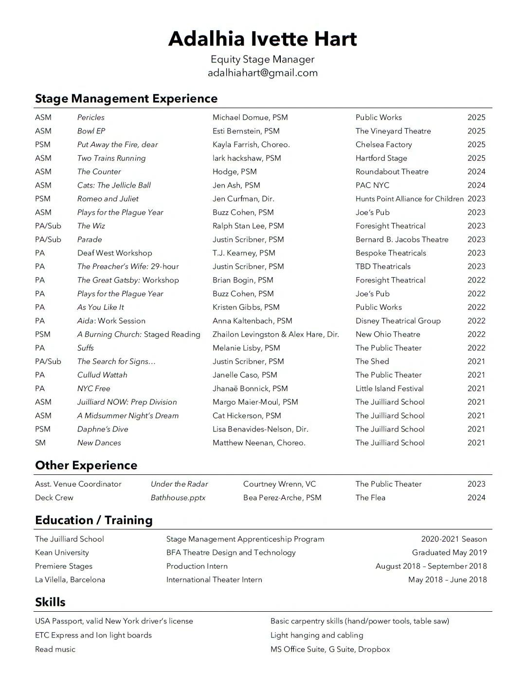 I am a stage manager in the New York Metropolitan area with a BFA in Theatre Design/Technology from Kean University and training from the Juilliard School. Most recently, I was an ASM on Public Works' Pericles which performed at the Cathedral of St. John the Divine.